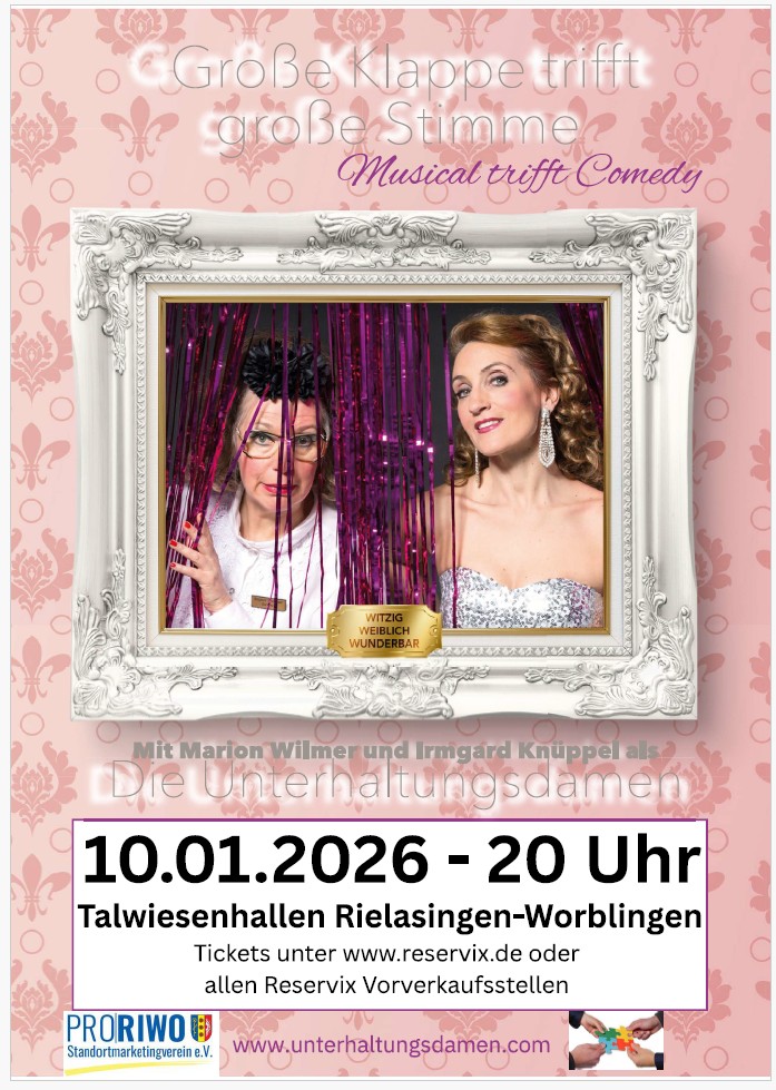 „ Erleben Sie großartigen Gesang, Comedy und spontane Einlagen. Die Unterhaltungsdamen präsentieren Marion Wilmer, Sopranistin und Musicalstar, sowie die Komikerin Gabi Weiss, in ihrer Paraderolle als Servicefachfrau Irmgard Knüppel. Eine fantastische Stimme trifft auf eine herrlich große Klappe – erfrischend und überraschend!